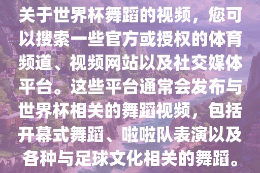 您可以在YouTube、抖音、快手等视频网站上搜索关键词如“世界杯舞蹈视频”、“世界杯开幕式舞蹈”等,以找到相关的视频,一些官方体育频道如CCTV-5等也可能会直播或回放世界杯相关舞蹈表演。