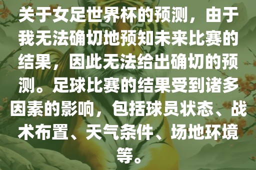 关于女足世界杯的预测,由于我无法确切地预知未来比赛的结果,因此无法给出确切的预测。足球比赛的结果受到诸多因素的影响,包括球员状态、战术布置、天气条件、场地环境等。