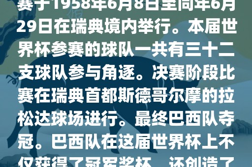 1. 比赛时间,1958年瑞典世界杯是第6届世界杯足球赛事。比赛于1958年6月8日至同年6月29日在瑞典境内举行。本届世界杯参赛的球队一共有三十二支球队参与角逐。决赛阶段比赛在瑞典首都斯德哥尔摩的拉松达球场进行。最终巴西队夺冠。巴西队在这届世界杯上不仅获得了冠军奖杯,还创造了著名的桑巴军团,为后来的足球历史留下了深刻的印记。