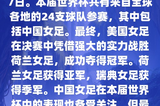摘要:2019年女足世界杯在法国举行,是首次在欧洲举办的世界杯。比赛时间为一个月,共有来自全球各地的24支球队参赛,包括中国女足。美国女足夺冠,荷兰和瑞典分别获得亚军和季军。中国女足表现备受关注但未进八强。本届世界杯还创造了多项纪录和亮点。