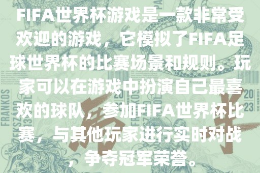 FIFA世界杯游戏是一款非常受欢迎的游戏,它模拟了FIFA足球世界杯的比赛场景和规则。玩家可以在游戏中扮演自己最喜欢的球队,参加FIFA世界杯比赛,与其他玩家进行实时对战,争夺冠军荣誉。