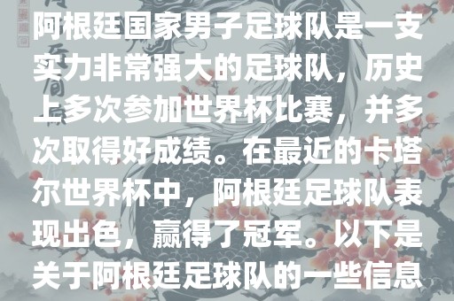 阿根廷足球队在世界杯历史上有着辉煌的战绩,曾参加过多次世界杯比赛,并多次进入决赛,阿根廷足球队在世界杯历史上拥有多个经典比赛和精彩瞬间,如马拉多纳的神奇表现等,在卡塔尔世界杯中,阿根廷足球队的表现备受瞩目,球队在比赛中展现出了强大的实力和精湛的技艺,最终成功夺冠,球队的核心球员梅西在比赛中表现出色,成为球队的关键人物之一,阿根廷足球队在卡塔尔世界杯中还展现出了年轻球员的潜力和实力,为未来的比赛打下了坚实的基础。