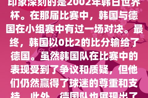 韩国和德国在世界杯足球赛中有过多次交锋。其中,最令人印象深刻的是2002年韩日世界杯。在那届比赛中,韩国与德国在小组赛中有过一场对决。最终,韩国以0比2的比分输给了德国。虽然韩国队在比赛中的表现受到了争议和质疑,但他们仍然赢得了球迷的尊重和支持。此外,德国队也展现出了强大的实力和战术素养,赢得了球迷们的赞赏。