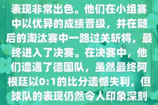 在2014年世界杯中,阿根廷表现出色,小组赛顺利晋级,并在淘汰赛中展现强大的实力,最终进入决赛。面对德国队,虽然以0:1的比分失利,但球队表现令人印象深刻。