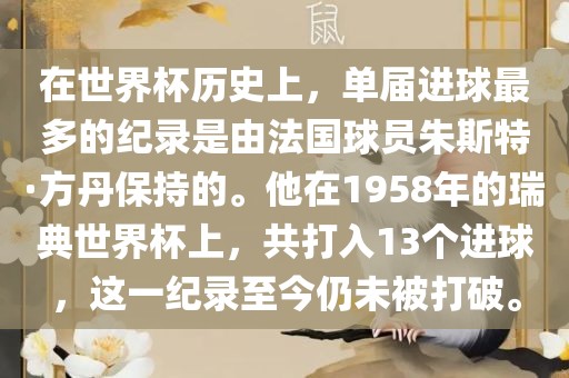 法国球员朱斯特·方丹在1958年瑞典世界杯上创造了单届进球最多的纪录,共打入13个球,这一纪录至今无人打破。他在该届世界杯上的出色表现使他成为足球历史上的传奇人物。