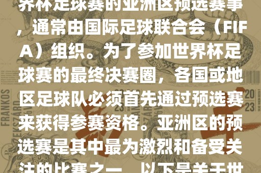 世界杯亚洲区预选赛是FIFA世界杯足球赛的亚洲区域选拔赛,由国际足球联合会组织。为了获得世界杯参赛资格,各国或地区足球队需通过激烈的预选赛竞争。亚洲区的预选赛备受关注,是世界上最具竞争性和关注的比赛之一。