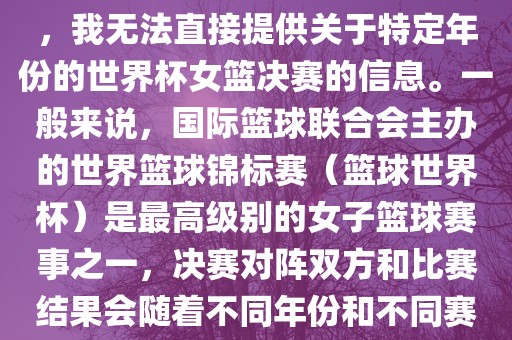 由于女子篮球赛事体系的不同,我无法直接提供关于特定年份的世界杯女篮决赛的信息。一般来说,国际篮球联合会主办的世界篮球锦标赛(篮球世界杯)是最高级别的女子篮球赛事之一,决赛对阵双方和比赛结果会随着不同年份和不同赛事版本而有所变化。